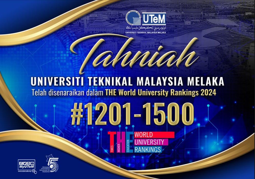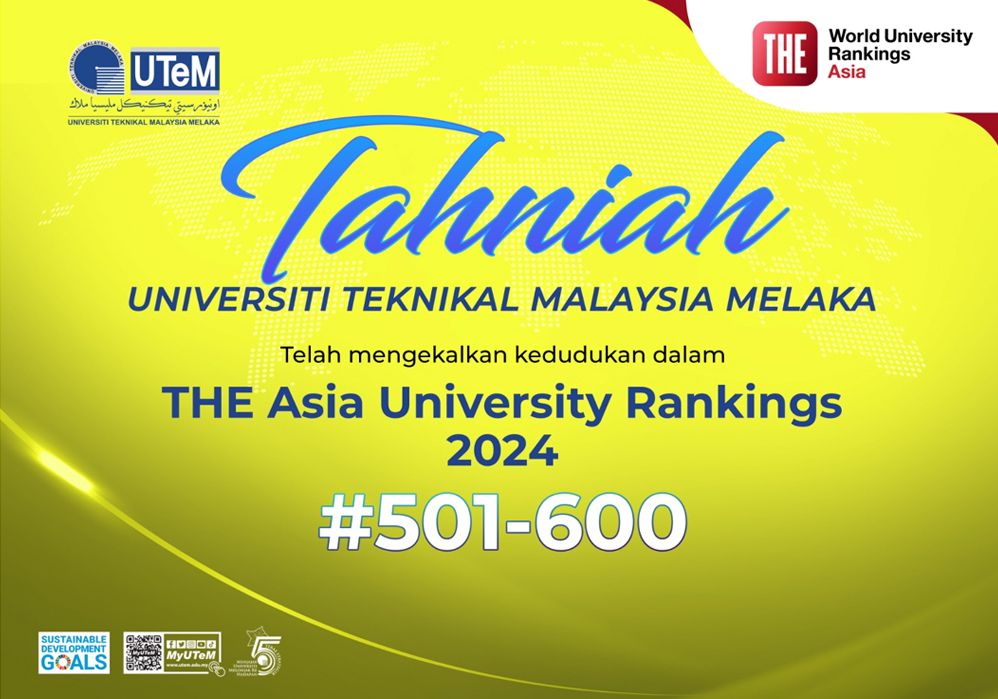 Tahniah, Universiti Teknikal Malaysia Melaka (UTeM) telah mengekalkan kedudukan dalam Penarafan THE Asia University Ranking 2024 dengan kedudukan, #501 – 600.